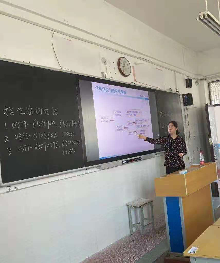在驻马店遂平第一高级中学的高校招生咨询会中,张贴宣传海报的同时,并于教学楼1810教室进行招生宣讲活动,前来听宣讲和咨询的考生及家长络绎不绝。工作组老师们对学生和家长咨询的各种问题进行耐心细致的解答。会后与教务处主任针对优秀生源基地建设、维护进行了交流与研讨,达成了长期合作共识。