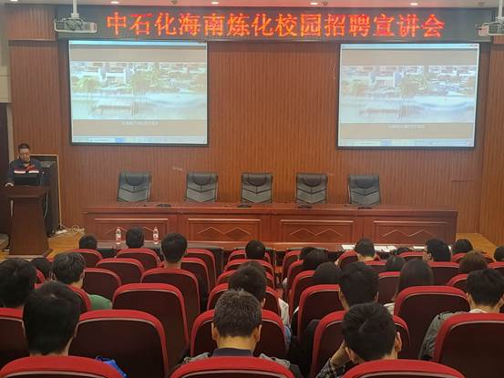 宣讲会上中石化海南炼化石油公司代表介绍了中石化海南炼化石油有限公司的工作环境、工资待遇、工作休假制度等,全面地展现了中石化海南炼化石油有限公司的实力和发展前景。现场气氛热烈,学生与企业代表积极交流。