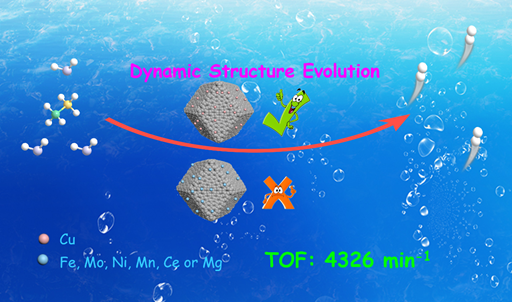氢能因其环境友好和高热值的优势被视为可持续的清洁能源。开发高效经济的催化剂并阐明催化剂的构效关系是催化制氢领域的关键挑战。针对这一挑战,本研究提出通过利用反应过程中催化剂的动态结构演变和贵金属-非贵金属之间的协同作用,设计高效制氢催化剂。该方法制备的催化剂在室温下催化氨硼烷水解制氢反应的转化频率(TOF)可达4326 min⁻¹。同时在催化剂的构效关系的理论研究方面也具有重要意义。通过研究发现一般的金属添加剂(Ni、Mo、Fe、Mn、Ce、Mg等)不具有改变Pt/Co3O4催化剂没有催化脱氢活性的作用,而只有Cu因其在促进还原过程中的独特作用可以起到“起死回生”的决定性作用。本研究不仅为开发高效可持续的催化剂提供了一种绿色简便的制备策略,更为深入理解氨硼烷水解催化剂的构效关系提供了理论依据。